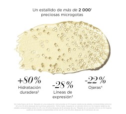 Doble fórmula ultraligera y concentrada en ingredientes potenciadores de juventud. Con más de 2000 microgotas que revitalizan, iluminan y despiertan la mirada. Hidrata, suaviza y calma la delicada piel del contorno de ojos. Alisa las líneas de expresión y mejora la firmeza. Minimiza las ojeras, potencia la luminosidad y proporciona un contorno de ojos renovado, descansado y radiante. Protege la piel del daño ocasionado por los radicales libres derivados de la exposición medioambiental.